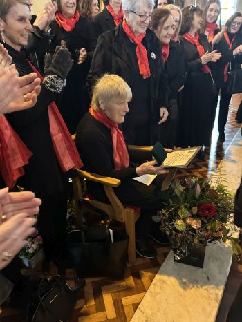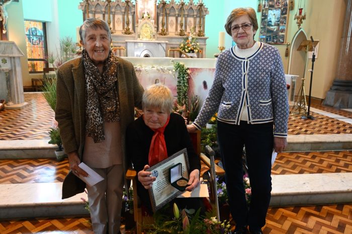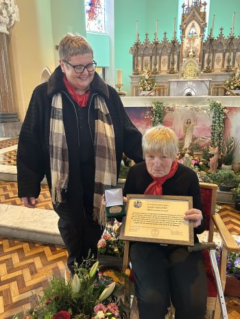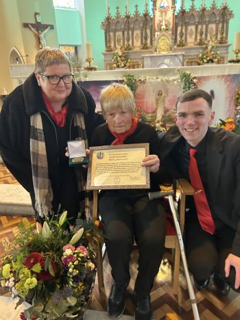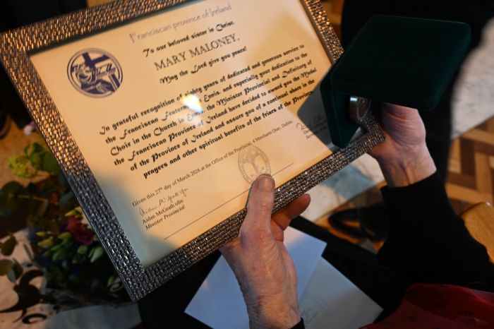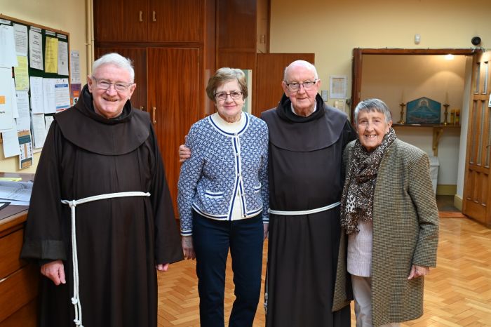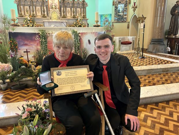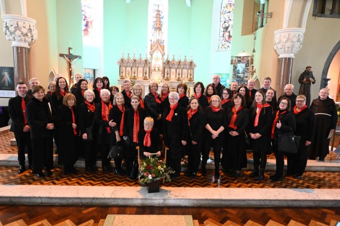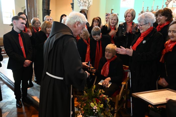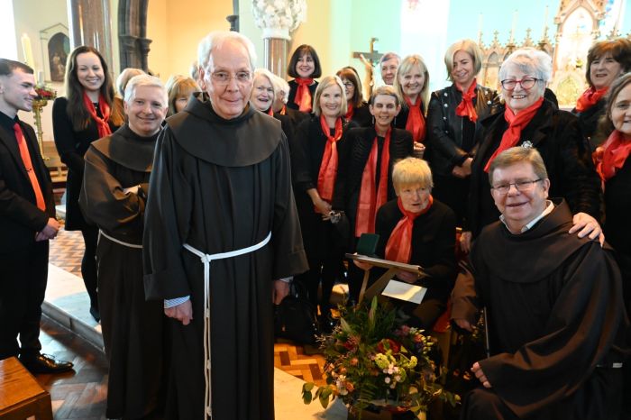 The Franciscan Friars presented Mary Moloney of Steele’s Terrace with a special Franciscan Medal in grateful recognition for 80 years of service to the Friary Choir on Easter Sunday, her 87th birthday. The medal was presented by Guardian Fr. Brendan McGrath OFM on behalf of the Franciscan Province of Ireland. Mary is pictured below with members of the Friary Choir, their musical directors and organist; Michelle Hennessy and Christopher Callinan, as well as members of the Franciscan Community. Photos courtesy of Bill Clohessy.